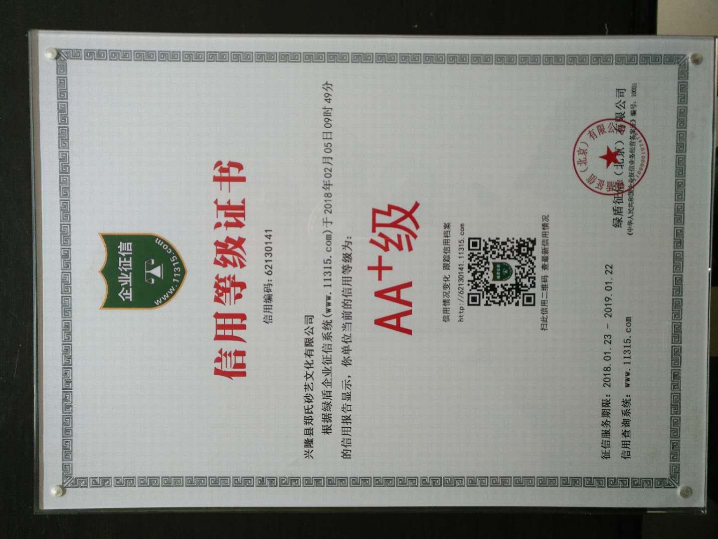 2018年2月5日,興隆縣鄭氏砂藝文化有限公司信用等級被綠盾征信(北京)有限公司確認(rèn)為AA+級。信用等級證書編碼為62130141。這預(yù)示著我公司的信用等級在不斷提升。