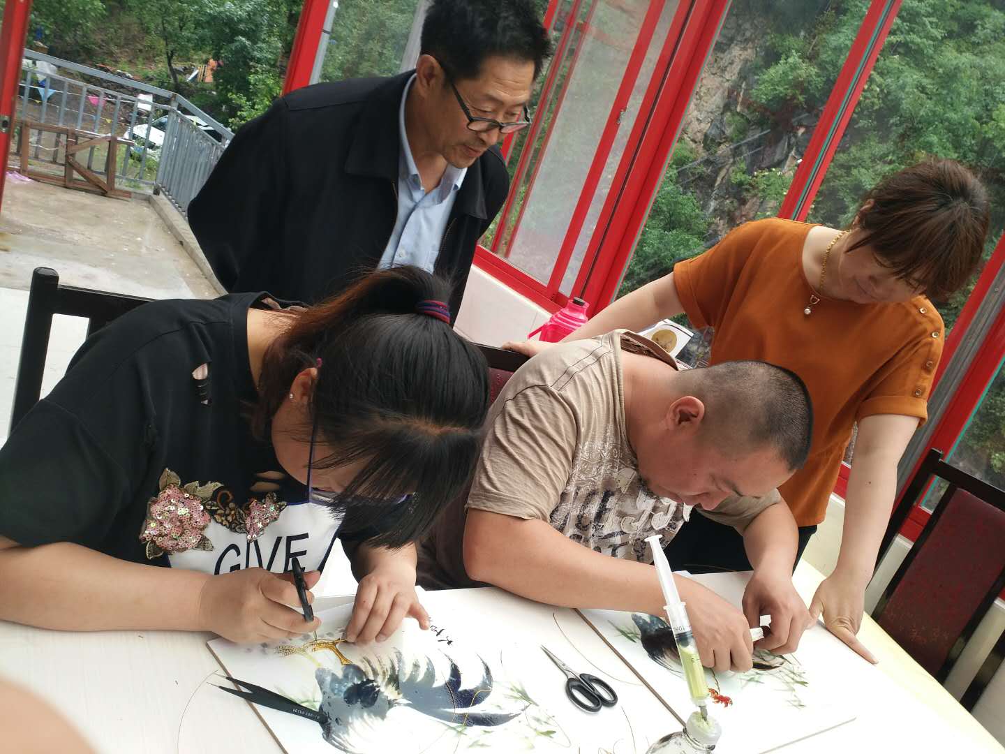 天津圣澤大通書畫院的老師們表示出對砂畫藝術(shù)的喜愛和贊賞,現(xiàn)場學習制作。