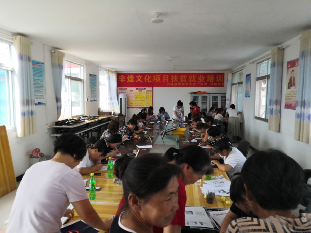 車河口村位于大杖子鎮(zhèn)政府東部2.5公里處,系潘家口水庫移民后靠村,處在車、柳、灤三河交匯點上。該村擁有人口1386口人,388戶。其中:貧困戶134戶,涉及貧困人口429人。由于大部分青壯勞力大都外出務工,村里只剩婦女、老人和兒童留守在家,婦女們除了給幾畝地玉米除除草,剩余時間全部用在哄孩子和閑聊上。鄭氏砂藝非遺文化扶貧項目的介入,得到廣大村民的積極響應,紛紛來到村委會參加培訓,她們仔細聽講,認真研學。學員們從描摹到布絲、從調膠到鋪砂,不放過每一個細節(jié)。在手中的作品上展現自己的才華。目前公司已對該村成立“車河口村非遺扶貧就業(yè)工坊”,在貧困戶中選出了技術過硬、能力較強的婦女擔任車間主任,目前該就業(yè)工坊已正式運轉。