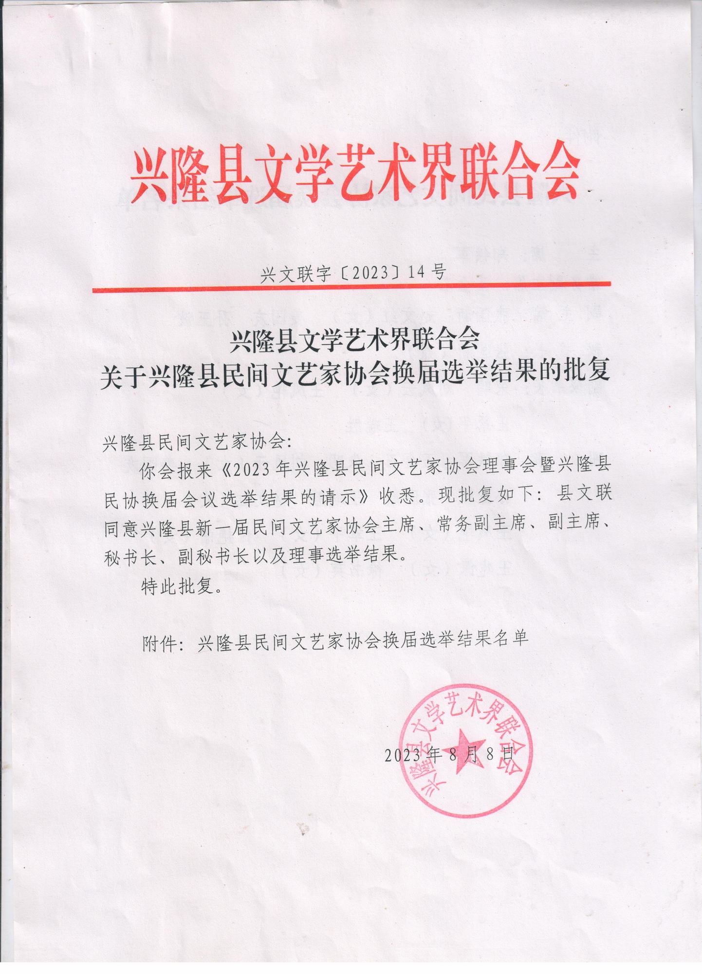 2023年8月8日,興隆縣民間文藝家協(xié)會(簡稱興隆縣民協(xié))提交的《2023年興隆縣民家文藝家協(xié)會理事會暨興隆縣民協(xié)換屆會議選舉結(jié)果的的請示》獲興隆縣文學(xué)藝術(shù)家聯(lián)合會批復(fù),興隆縣民協(xié)組織機(jī)構(gòu)成員的批復(fù)如下: