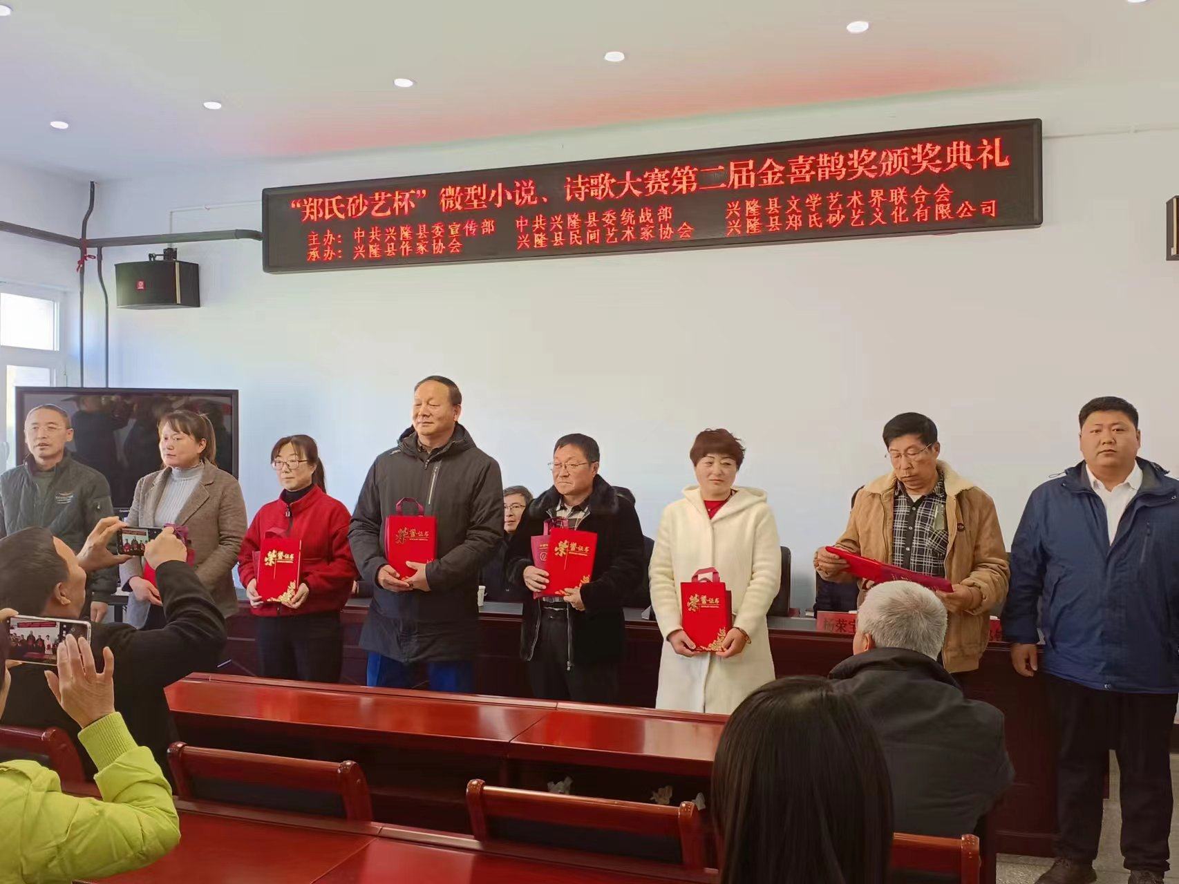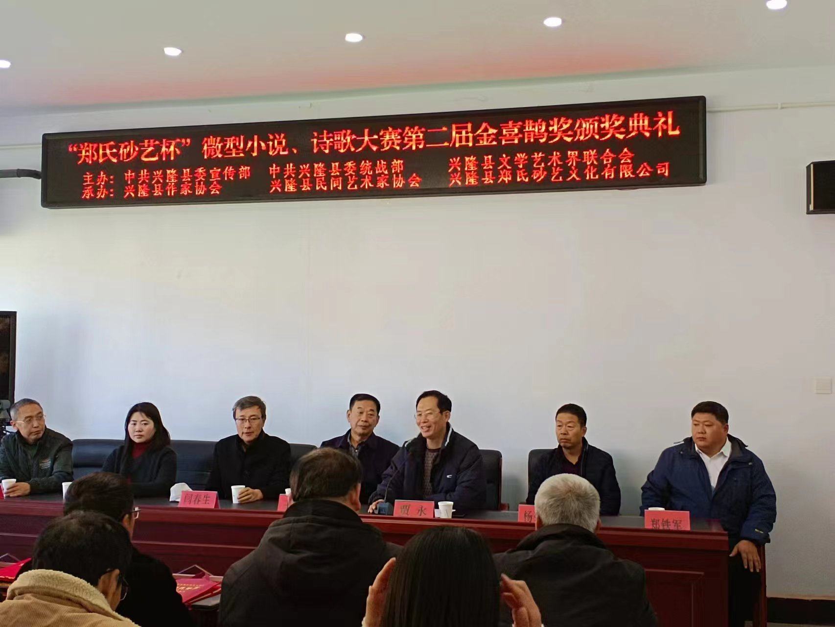 2023年11月9日上午,在興隆縣鄭氏砂藝文化有限公司舉辦了由中共興隆縣委宣傳部、中共興隆縣委統(tǒng)戰(zhàn)部、興隆縣文學(xué)藝術(shù)界聯(lián)合會主辦,興隆縣作協(xié)、興隆縣民間藝術(shù)家協(xié)會和興隆縣鄭氏砂藝文化有限公司承辦的“鄭氏砂藝杯”微型小說、詩歌大賽第二屆金喜鵲獎頒獎典禮,出席此次頒獎典禮的主要領(lǐng)導(dǎo)有承德市作家協(xié)會主席王琦,承德市文聯(lián)二級調(diào)研員閆春生,興隆縣委宣傳部副部長、文明辦主任溫偉,興隆縣委統(tǒng)戰(zhàn)部常務(wù)副部長楊榮寶,興隆縣作協(xié)主席王金石,興隆縣鄭氏砂藝文化有限公司董事長、縣民協(xié)主席鄭鐵軍及“鄭氏砂藝杯”微型小說、詩歌大賽獲獎人員,典禮由興隆縣文學(xué)藝術(shù)界聯(lián)合會主席賈永主持。