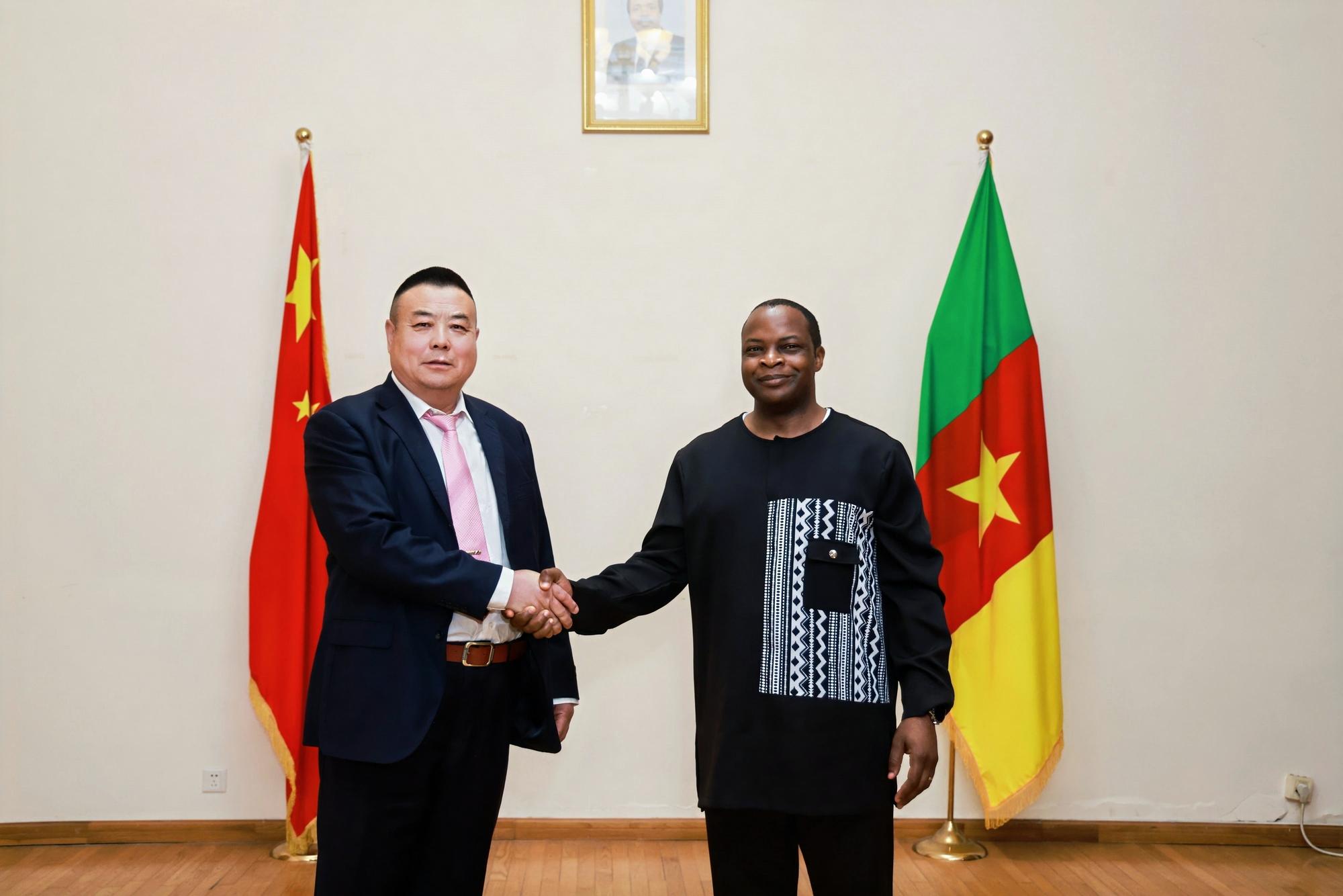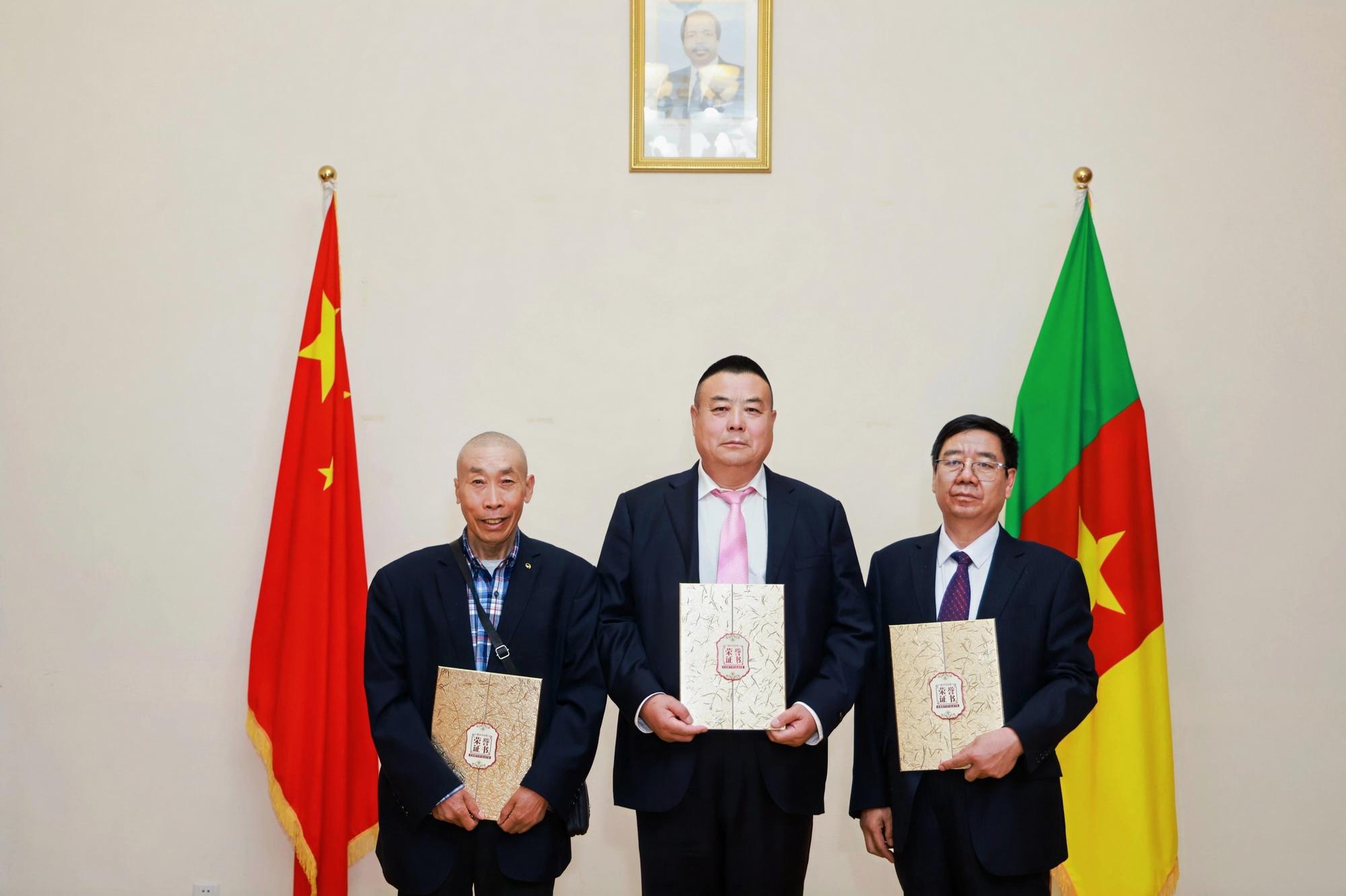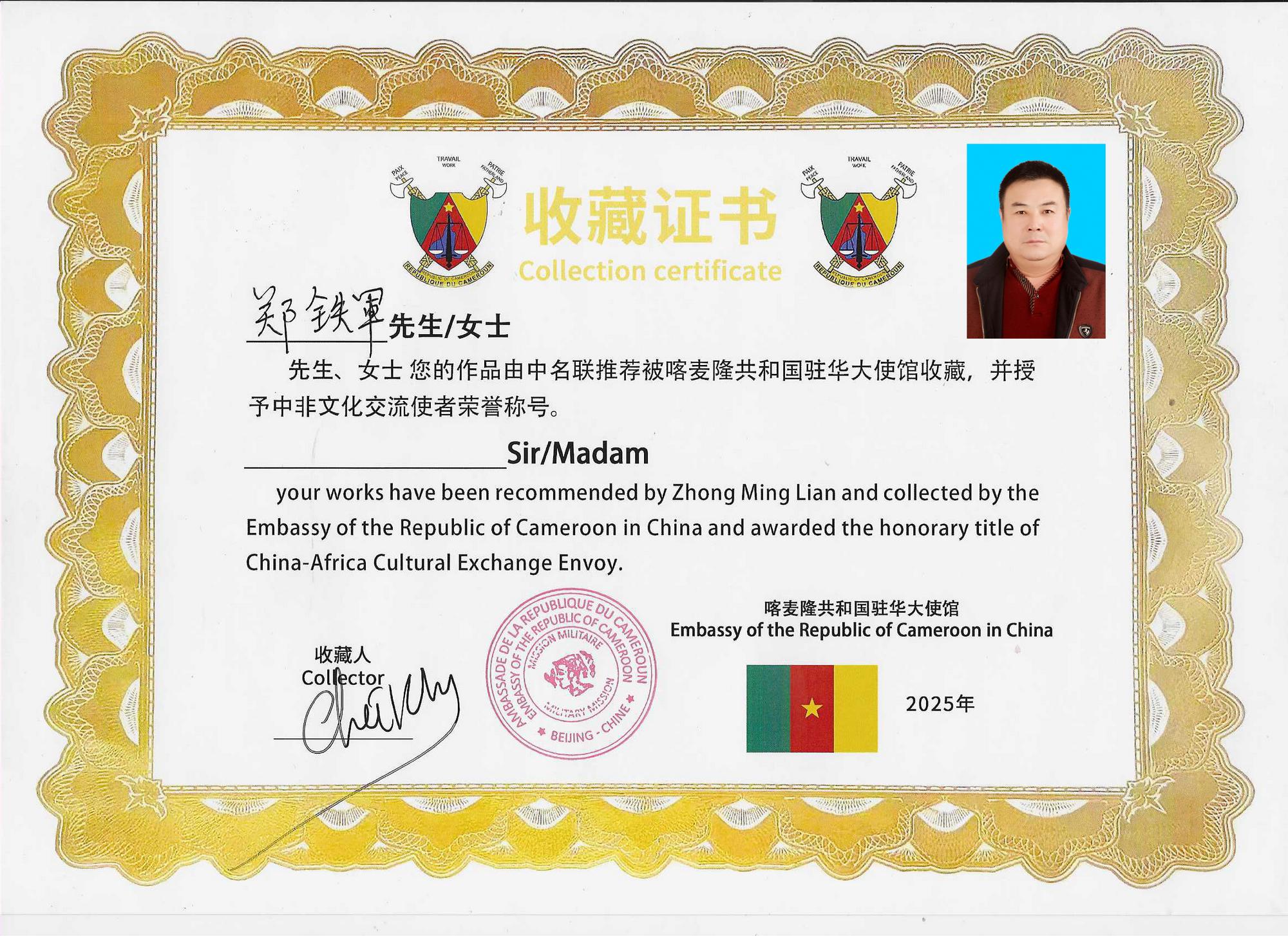 2025年4月26日,中名聯(lián)簽約國禮藝術(shù)家、非遺傳承人鄭鐵軍應(yīng)邀前往喀麥隆共和國駐華大使館,參與“一帶一路”中非文化交流活動?;顒蝇F(xiàn)場,其創(chuàng)作的非遺作品《平安福字》被喀麥隆大使館作為國禮永久收藏,標(biāo)志著河北興隆縣傳統(tǒng)手工藝在國際舞臺上的又一次精彩亮相,成為中非文化交流的重要載體??溌●v華使館外交官朱利安·弗雷迪·埃托瓦代表使館,向鄭鐵軍頒發(fā)收藏證書,并授予其“中非文化交流使者”榮譽稱號 。