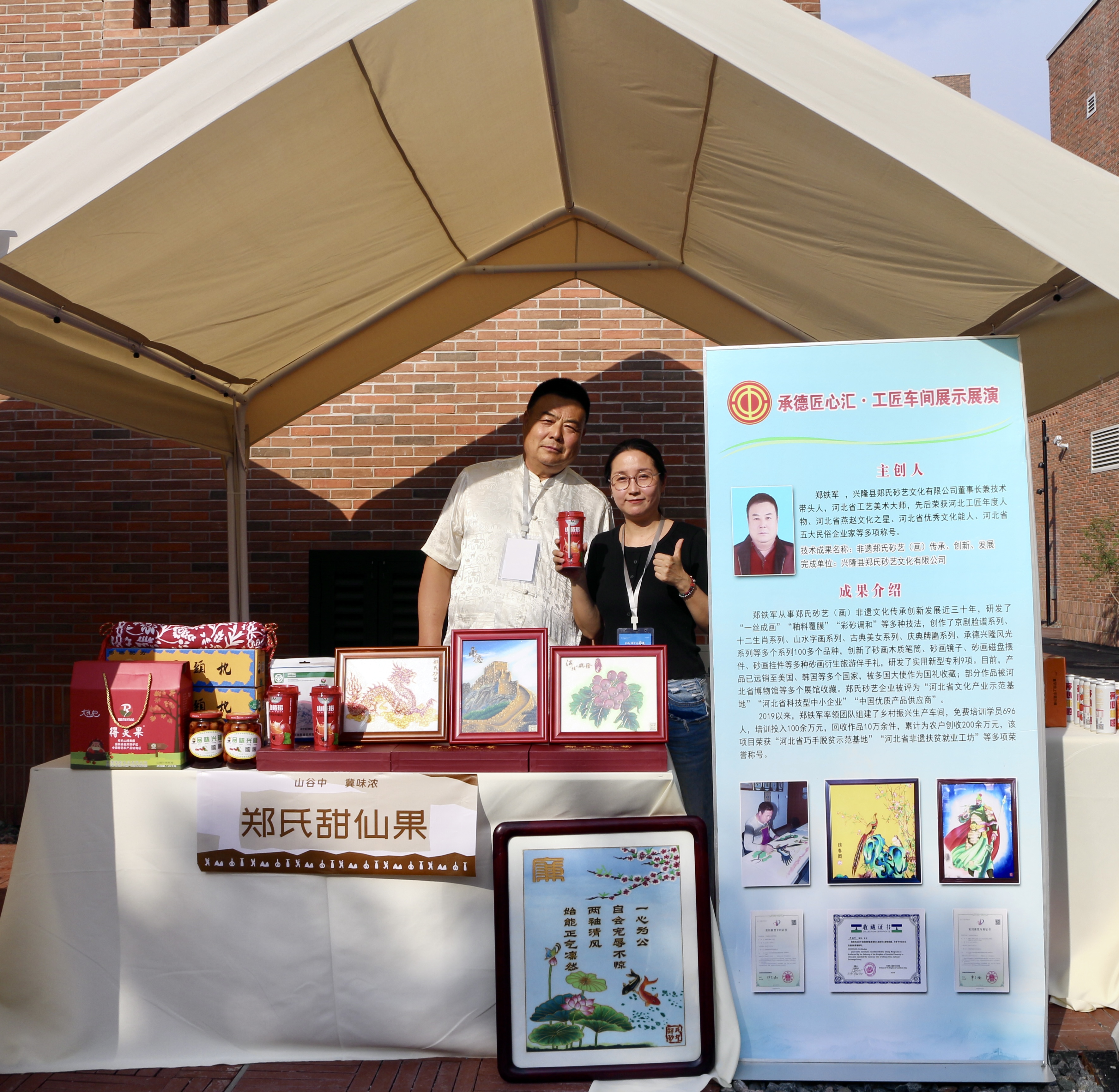 作為"長城腳下話非遺"的核心參展單位,鄭氏砂藝憑借融合傳統(tǒng)技藝與現代消費的創(chuàng)新實踐,成為本次非遺盛會的焦點之一。展臺前人潮涌動,金絲鑲嵌的《承德長城》砂畫以數萬次精準點砂,生動再現金山嶺長城的雄渾氣勢。現場同步陳列的《紅火》《中國龍》等極具興隆地域特色的經典作品,以及鄭氏砂藝鮮甜果、山楂果鋪、山楂撈和藥浸山楂核制成的"御用頸枕"系列產品,引得與會各級領導與游客紛紛駐足品鑒與認可。